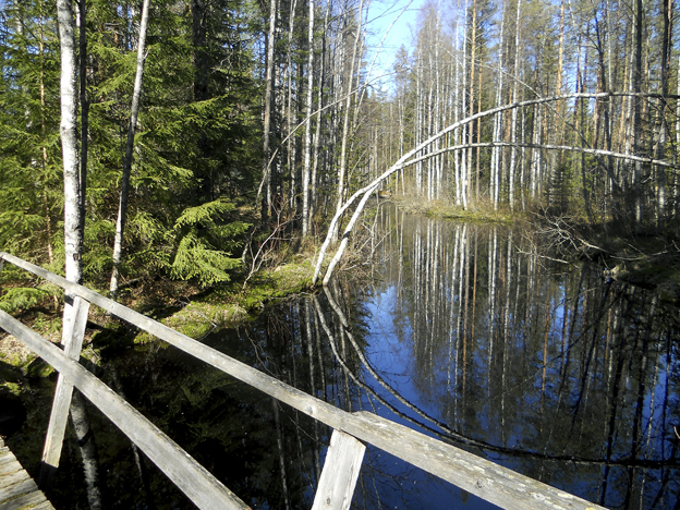 Reitin alussa kuljetaan puusiltaa pitkin pienen laskujoen yli maastoon, josta jatkuu helppokulkuinen reitti kohti Kokko-Valkeinen kotalaavua.